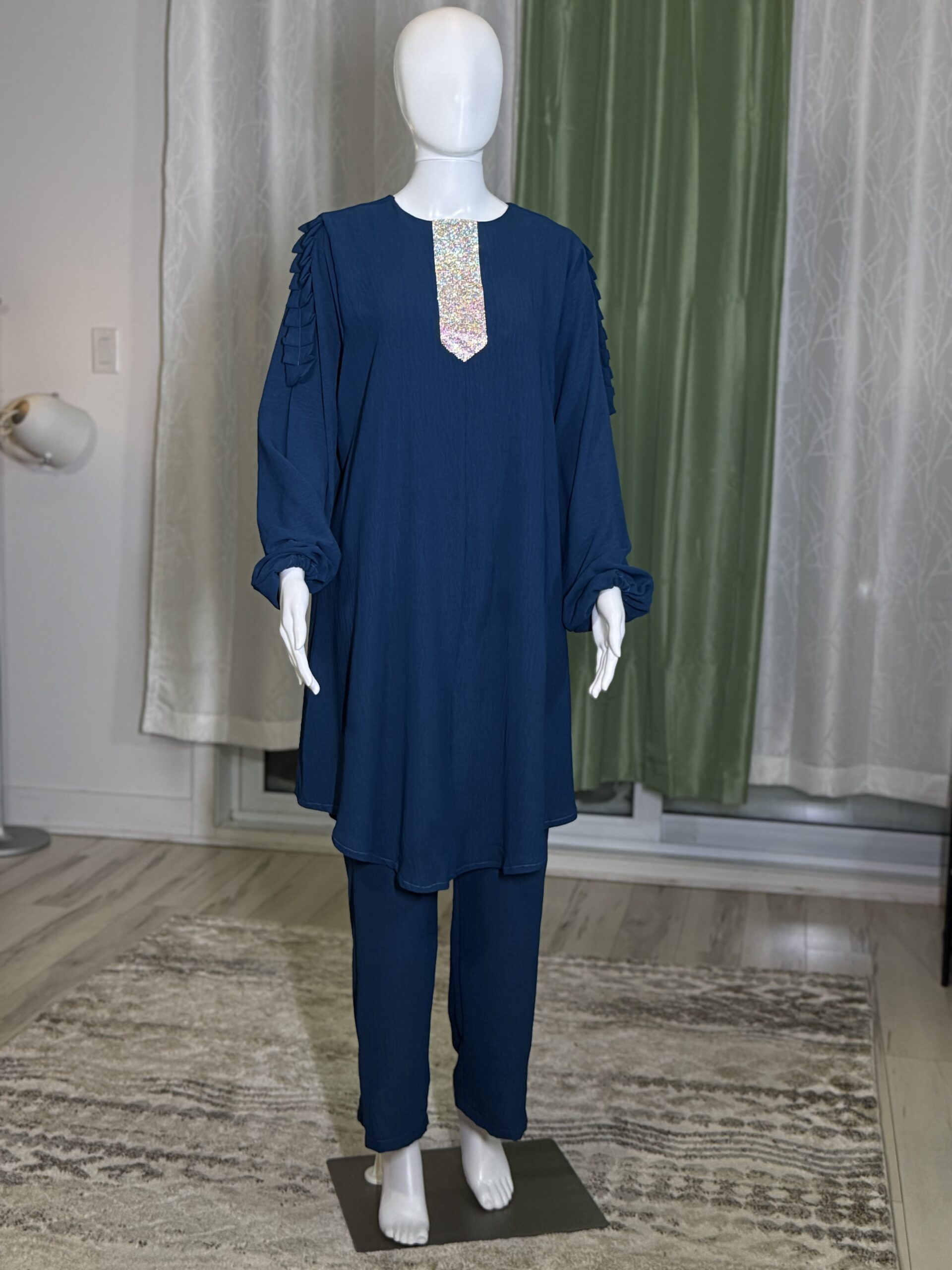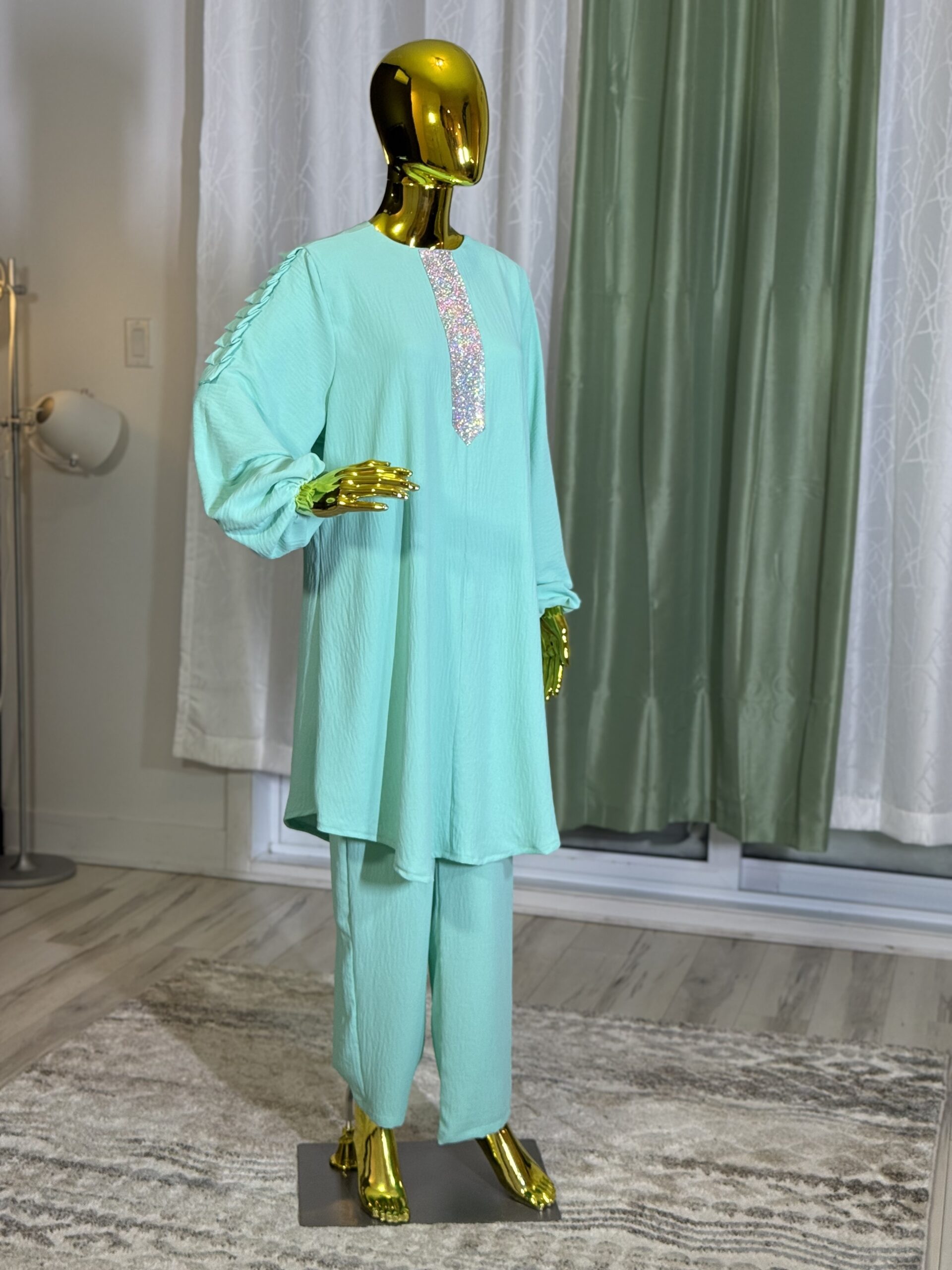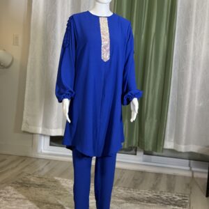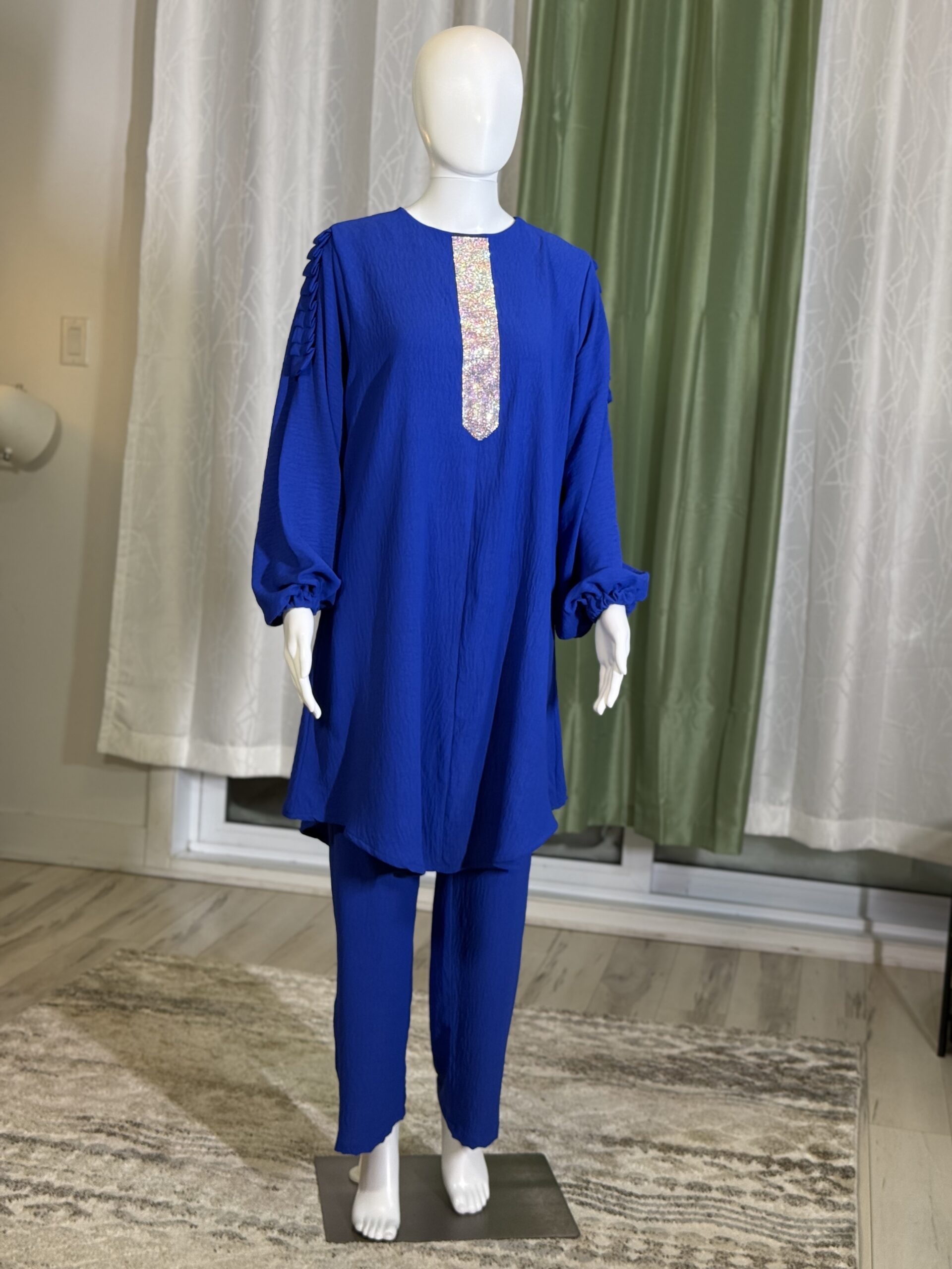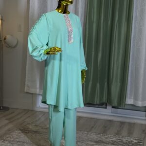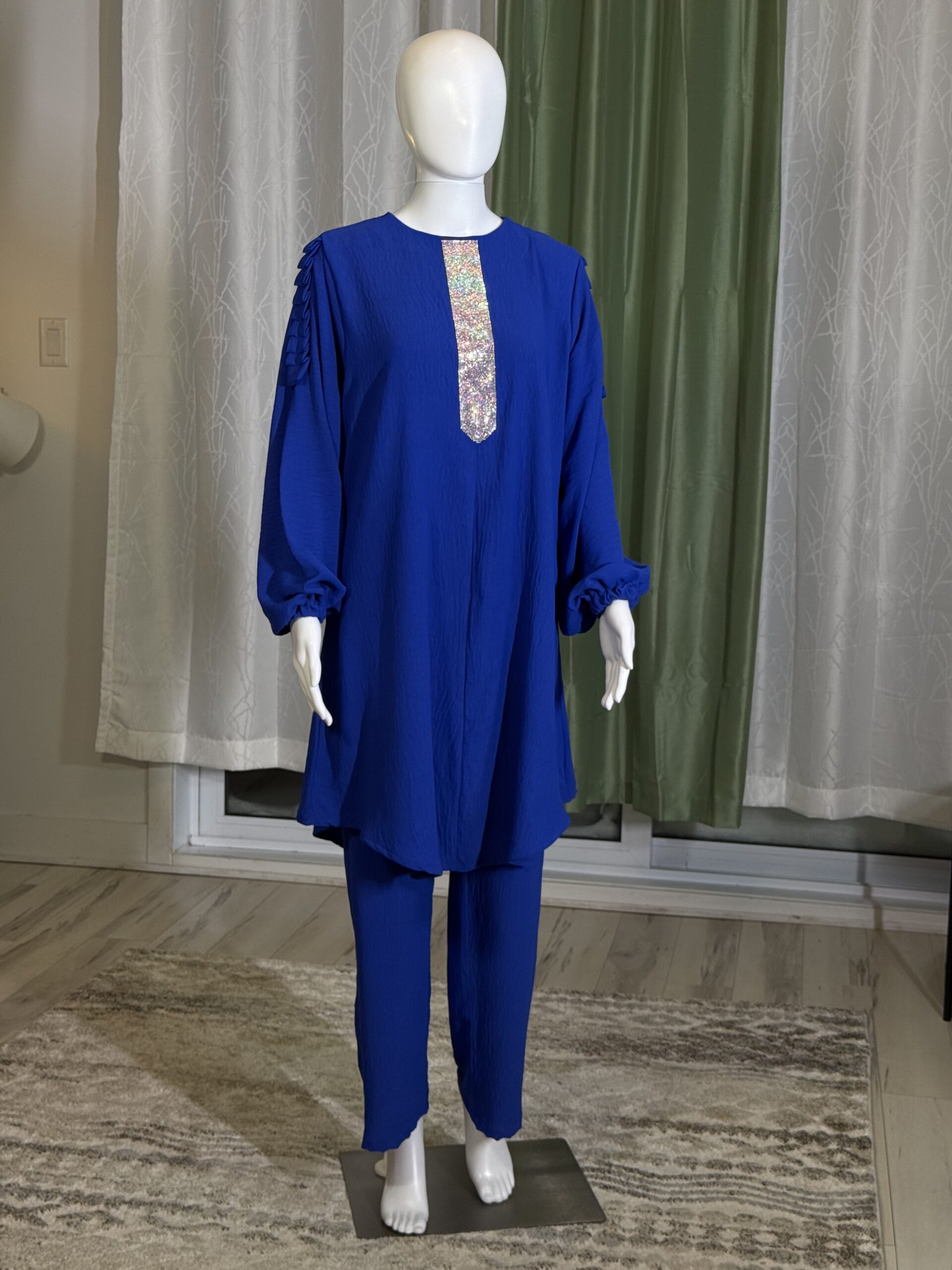 Introducing the Sabika Set: Elegant round neck tunic with a shaped rhinestone design and long sleeves with pleated detailing, paired with loose long pants. This set is perfect for spring and autumn, offering comfort and style for both lounging and running errands. Made with high-quality materials, it ensures a comfortable and breathable fit.