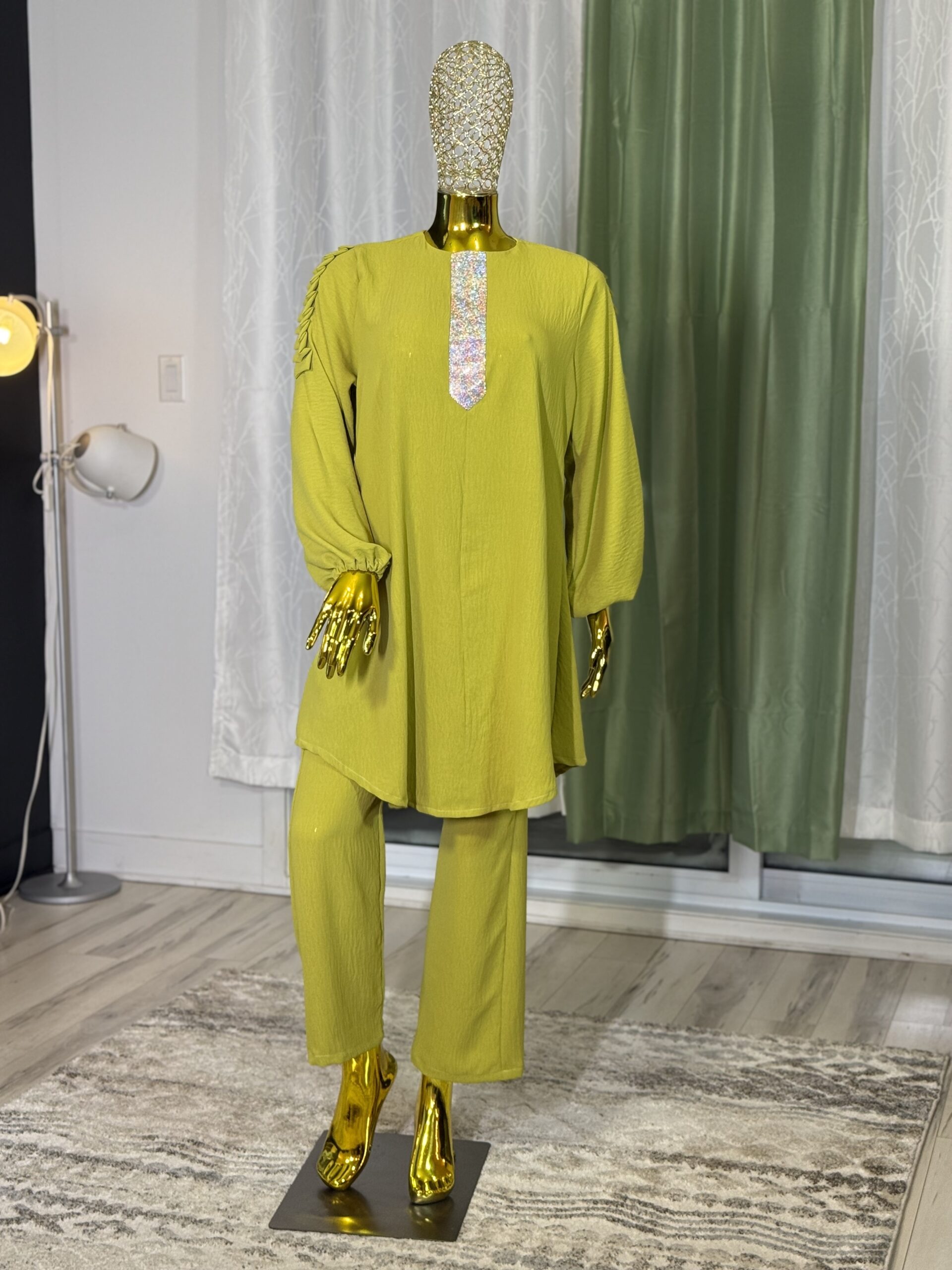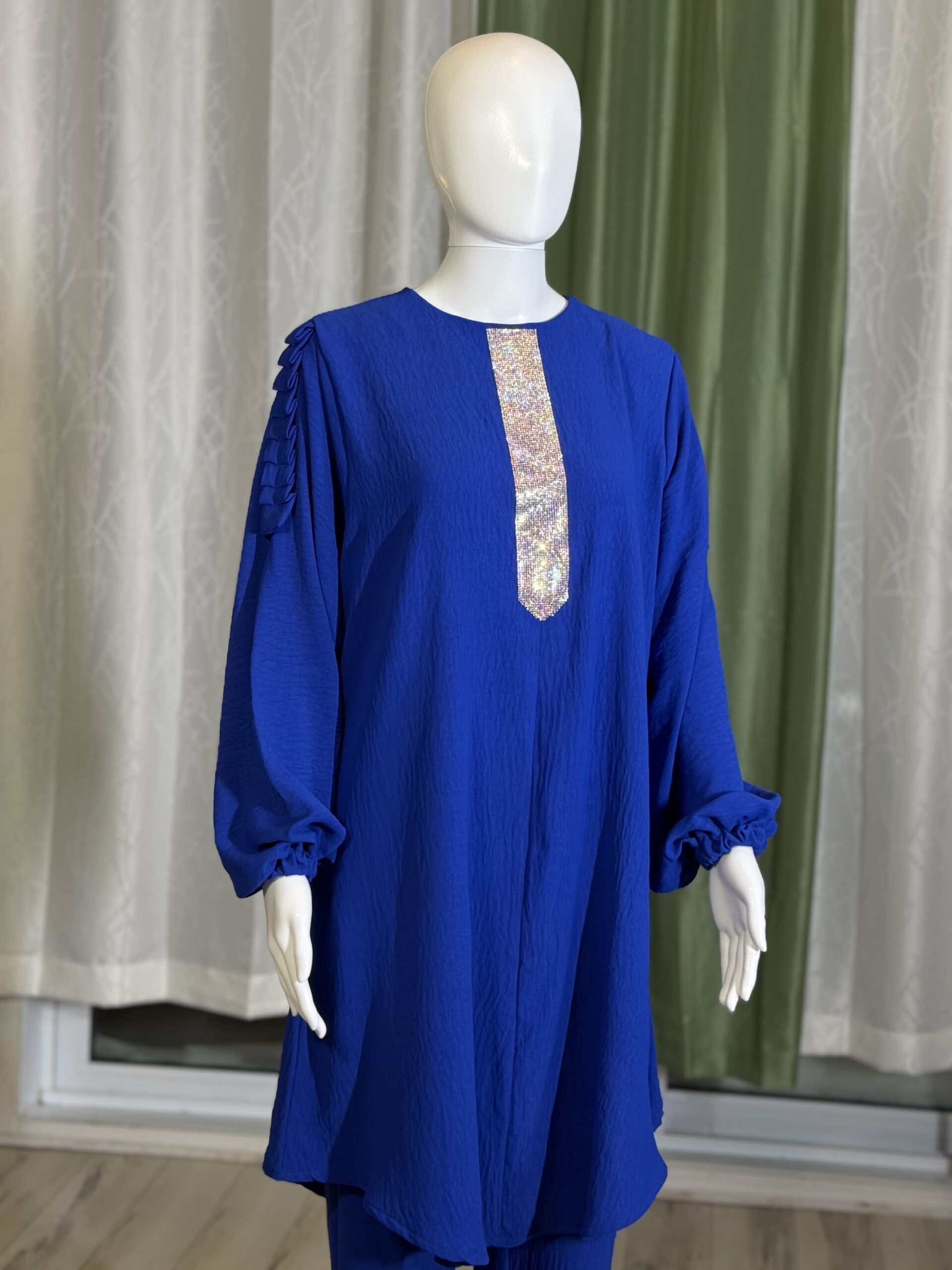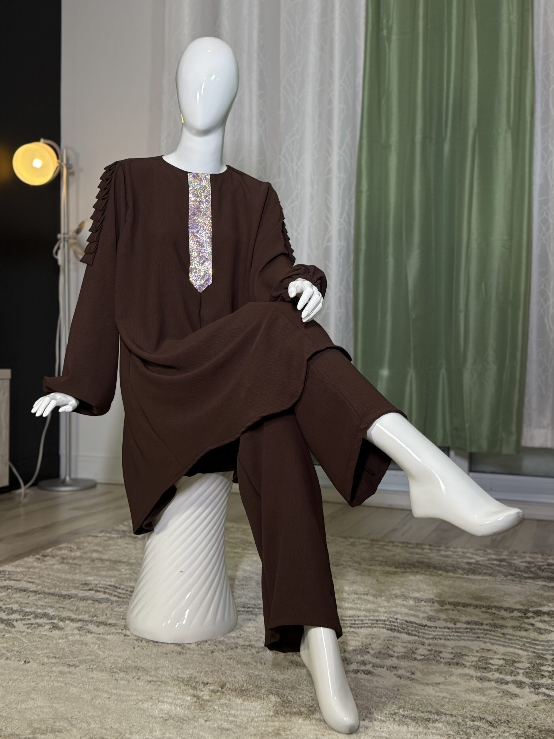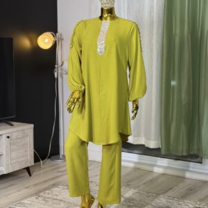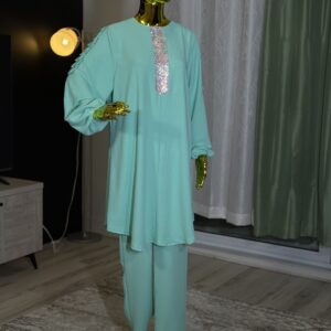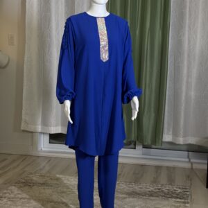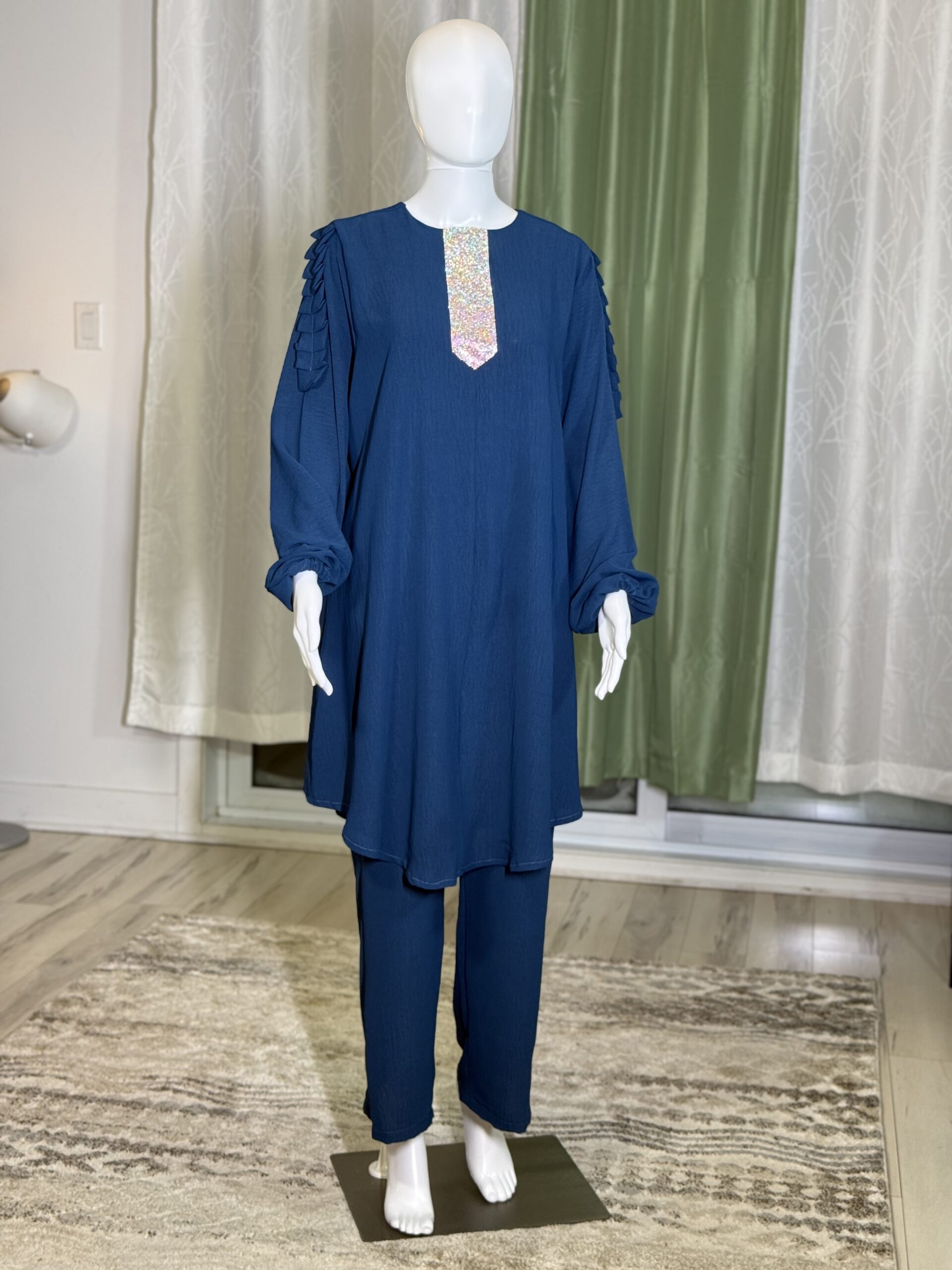 Introducing the Sabika Set: Elegant round neck tunic with a shaped rhinestone design and long sleeves with pleated detailing, paired with loose long pants. This set is perfect for spring and autumn, offering comfort and style for both lounging and running errands. Made with high-quality materials, it ensures a comfortable and breathable fit.
