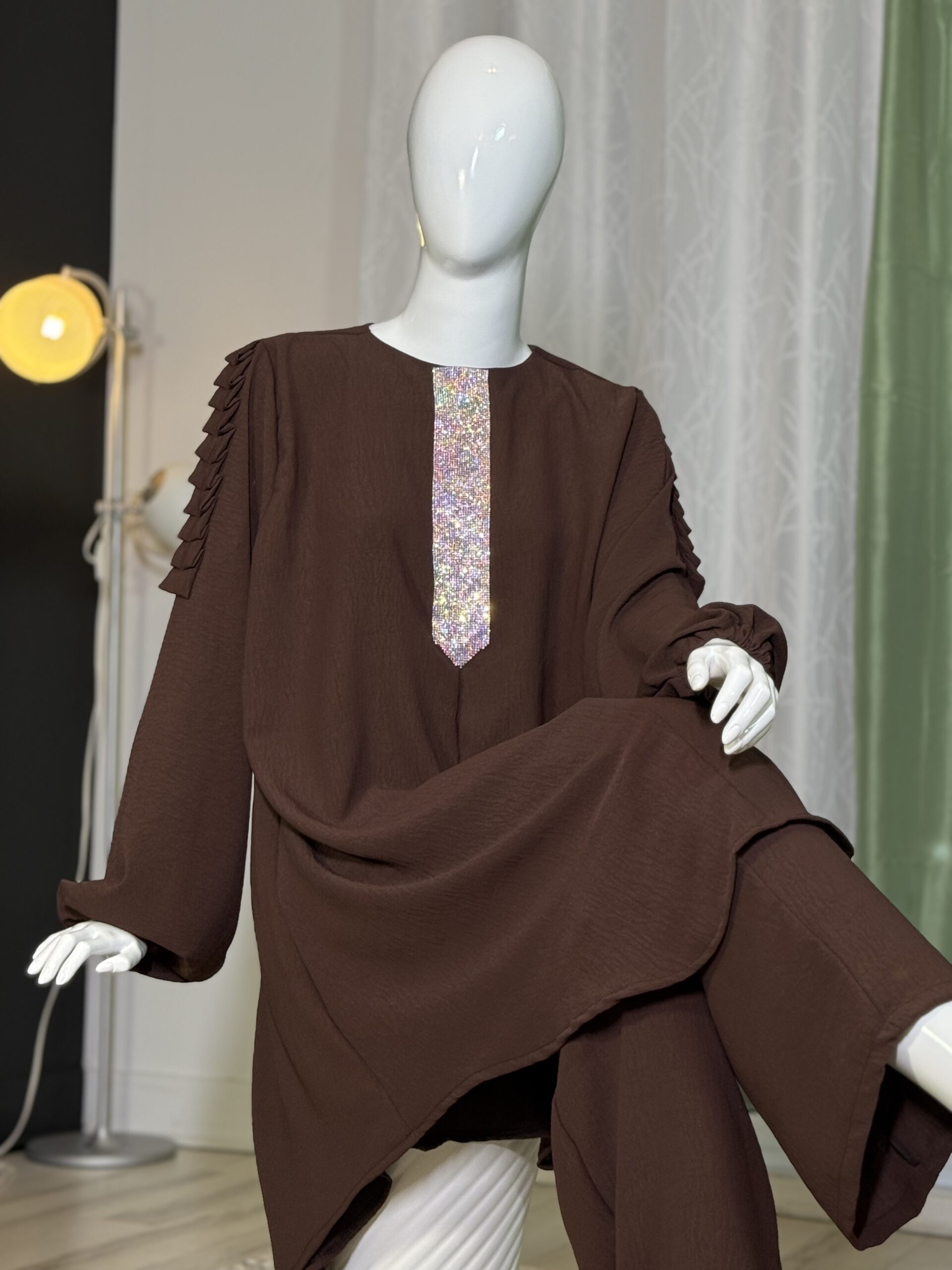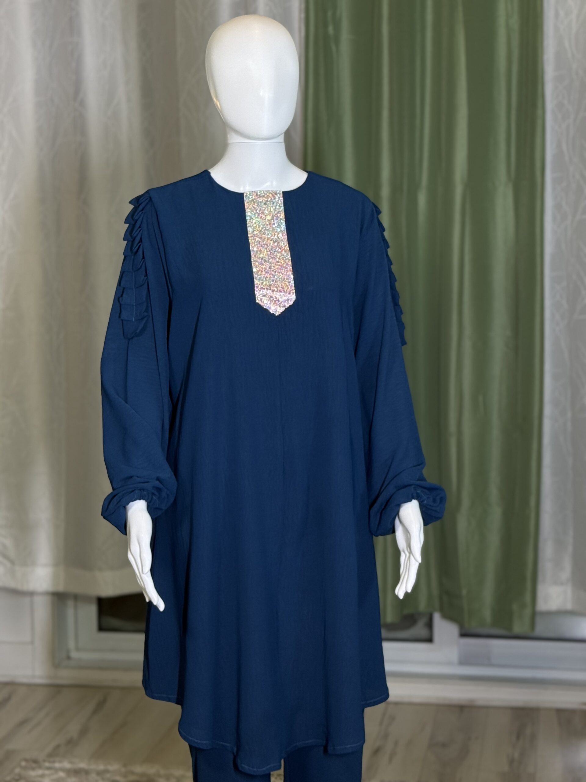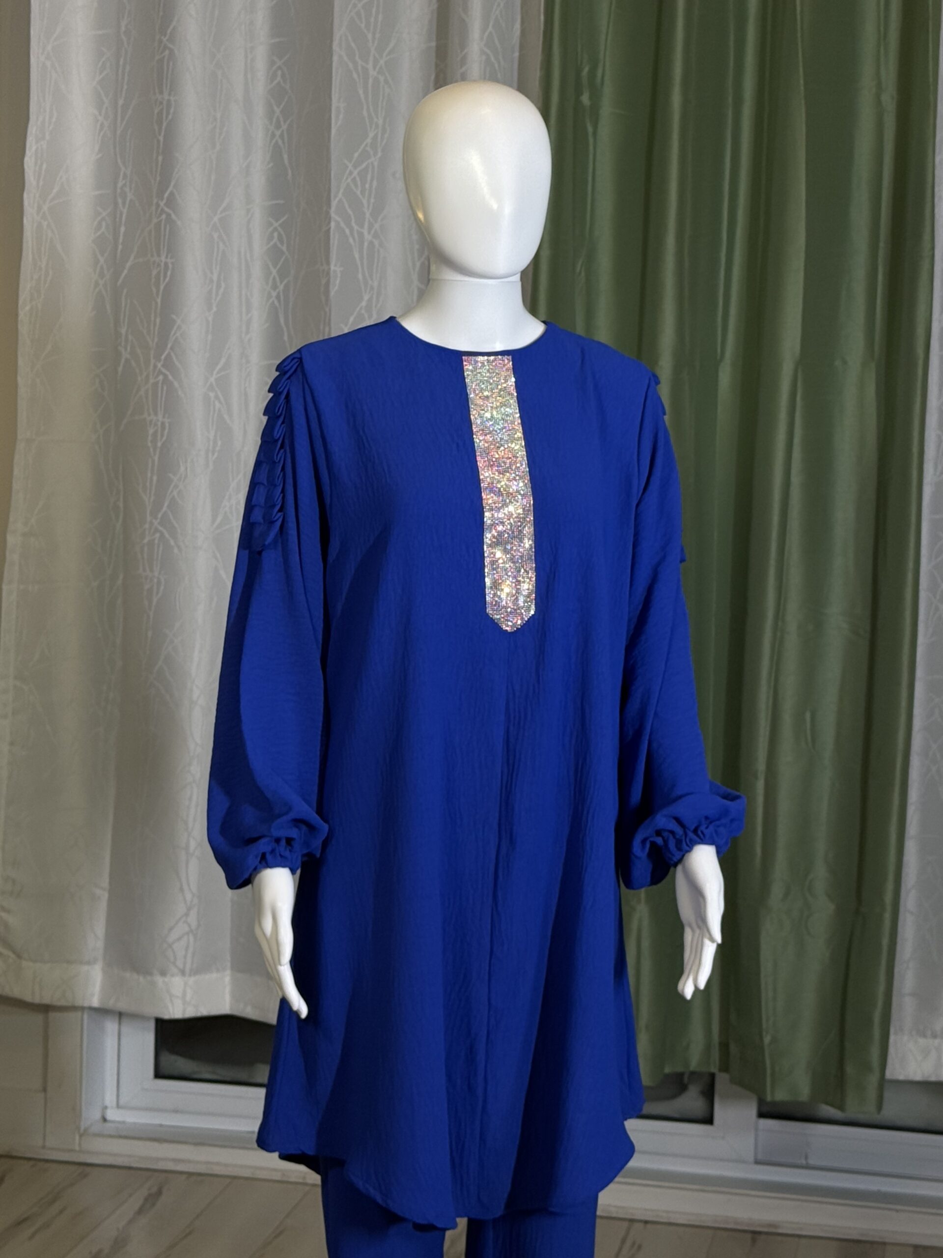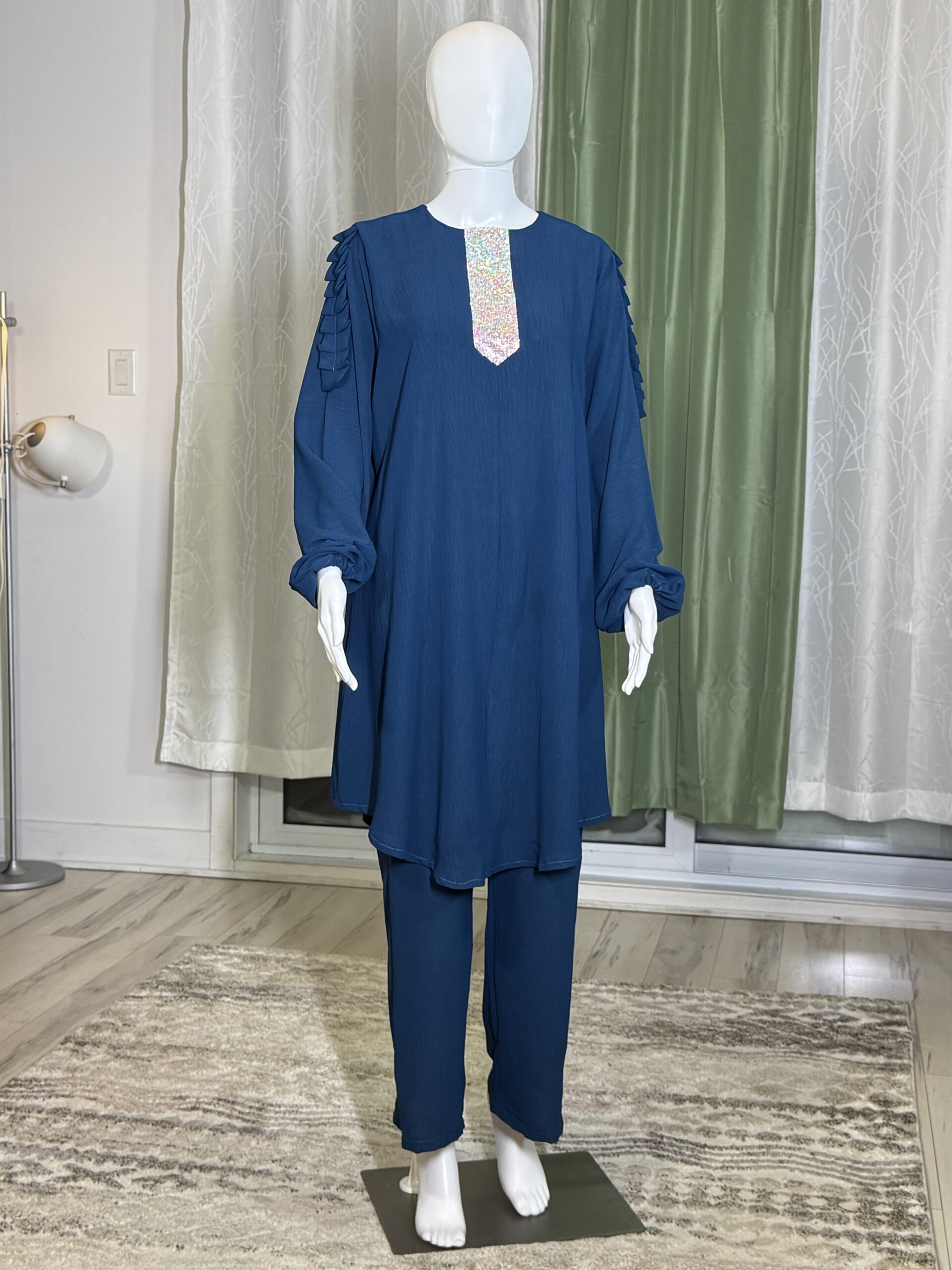 Introducing the Sabika Set: Elegant round neck tunic with a shaped rhinestone design and long sleeves with pleated detailing, paired with loose long pants. This set is perfect for spring and autumn, offering comfort and style for both lounging and running errands. Made with high-quality materials, it ensures a comfortable and breathable fit.