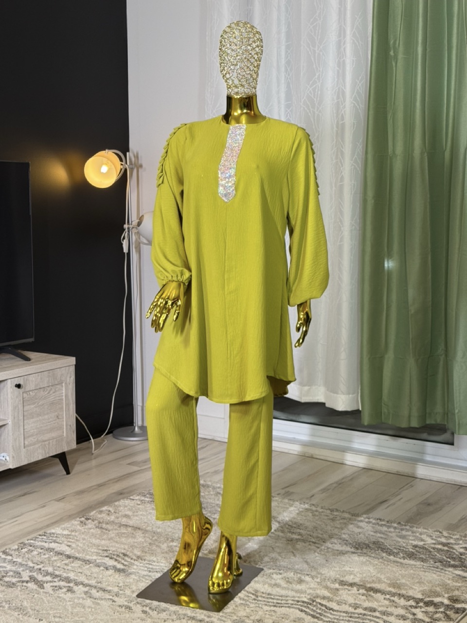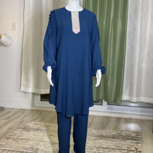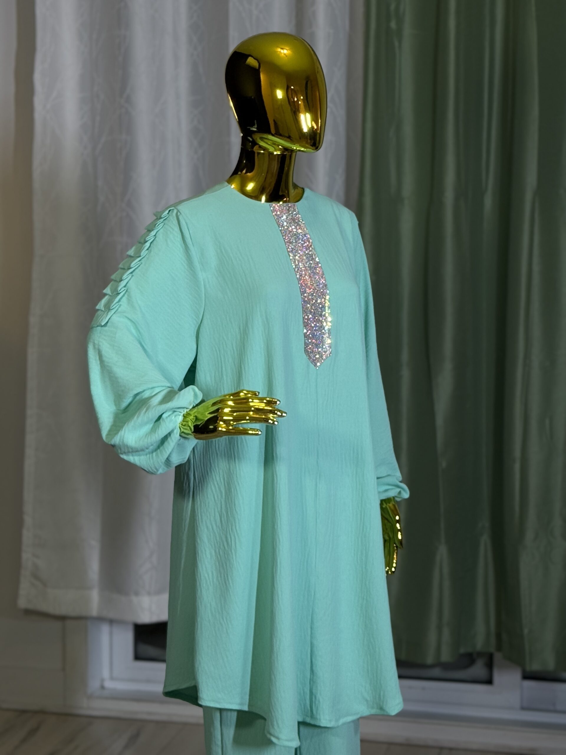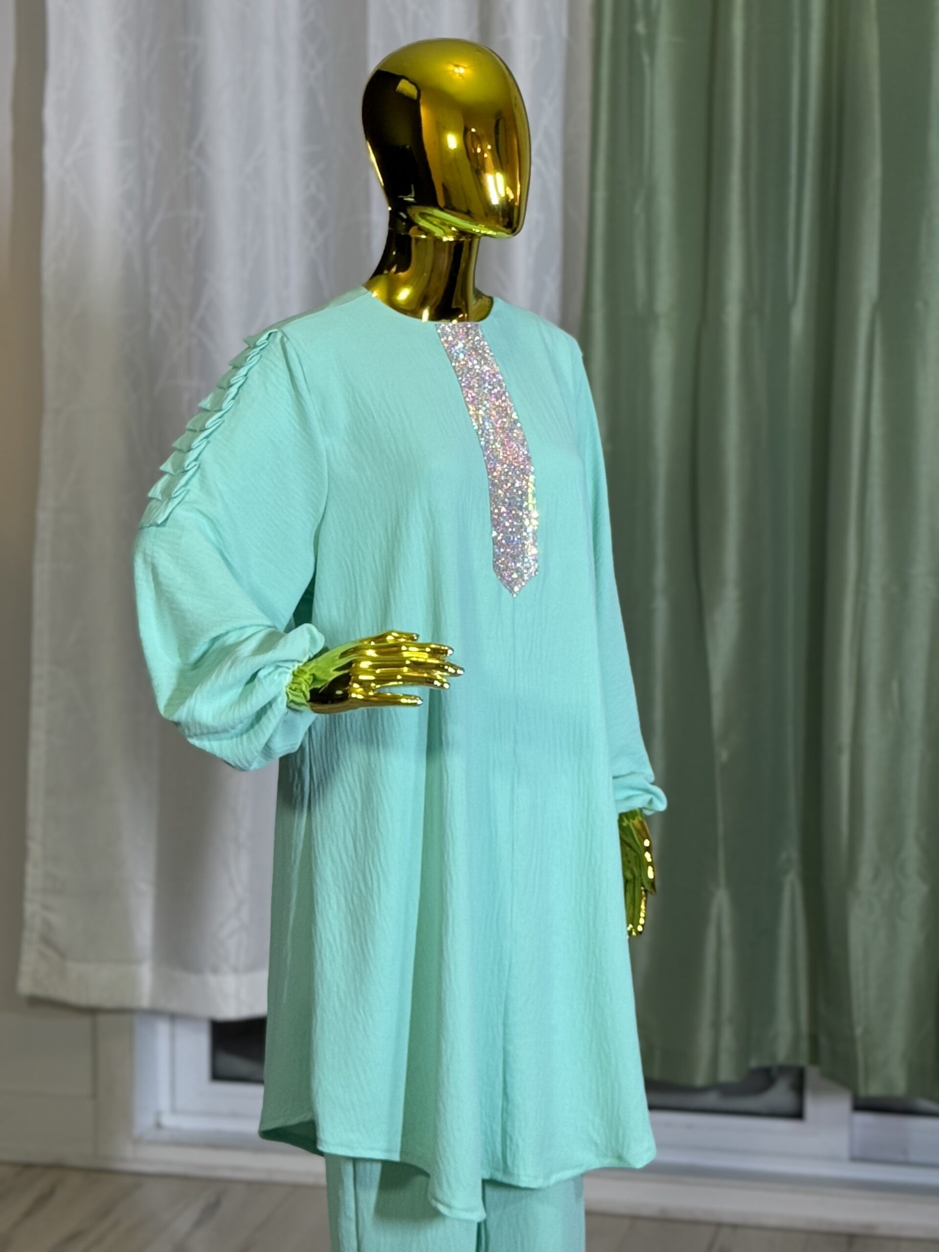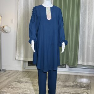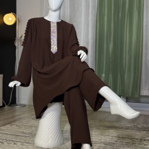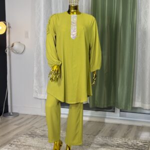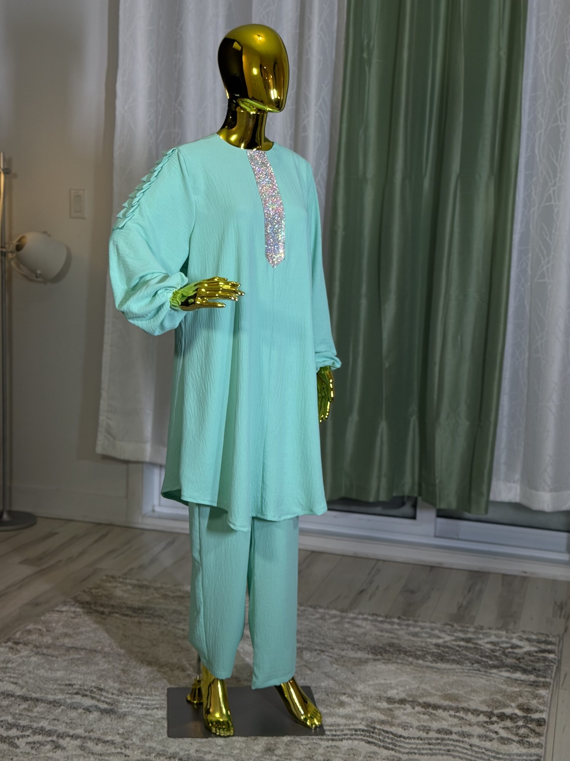 Introducing the Sabika Set: Elegant round neck tunic with a shaped rhinestone design and long sleeves with pleated detailing, paired with loose long pants. This set is perfect for spring and autumn, offering comfort and style for both lounging and running errands. Made with high-quality materials, it ensures a comfortable and breathable fit.